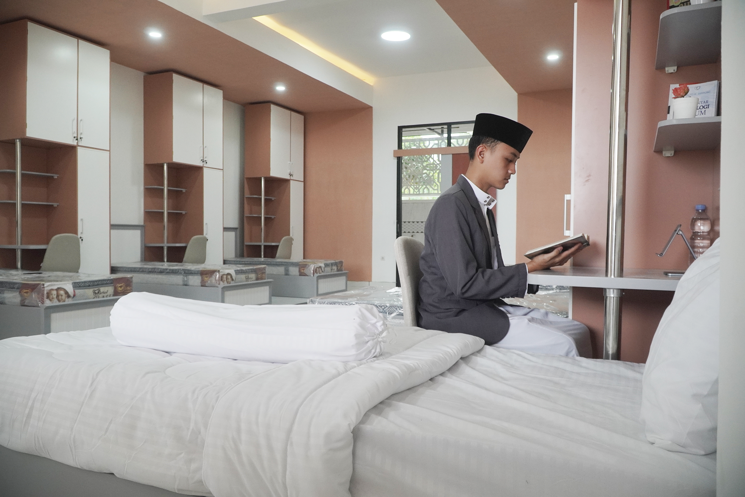 Kamar yang diisi 8 anak di dampingi 1 ustadz/ustadzah setiap 2 kamar, kasur single bed, kamar mandi 2 setiap kamarnya, meja da kursi belajar untuk menunjang belajar santri/santriwati di asrama