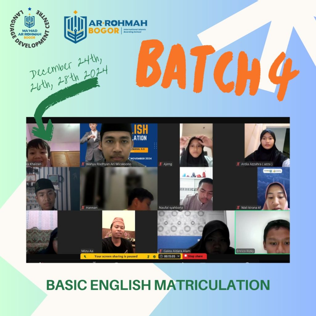 “Alhamdulillah untuk program yang telah berjalan adalah Basic English Matriculation diikuti sebagian besar oleh murid di jenjang SD dan SMP yang telah mendaftar ke Ma’had Ar-Rohmah Bogor dari berbagai daerah seperti Oku Selatan, Jakarta, Bogor, Bekasi, dan lain-lain,” ujar Ustadz Wahyu.